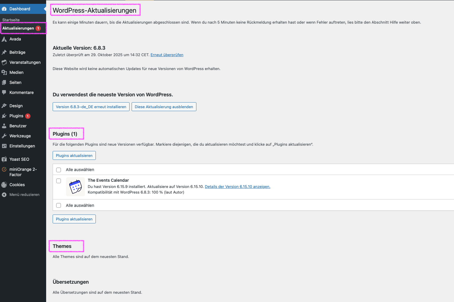 WordPress selbst, dein Theme (z.B. Avada) und deine Plugins. Das sind die zentralen Bausteine deiner Website – und alle drei bekommen regelmässig Updates.